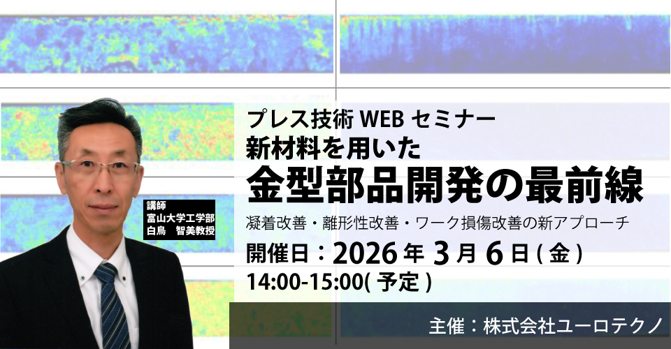 第4回プレス技術Webセミナーを開催いたします。今回は、富山大学工学部の白鳥教授をお迎えし、「新材料による金型部品開発」をテーマにパンチ・ダイにおける凝着や離型性向上を目的とした最新の研究開発事例をご講演いただきます。