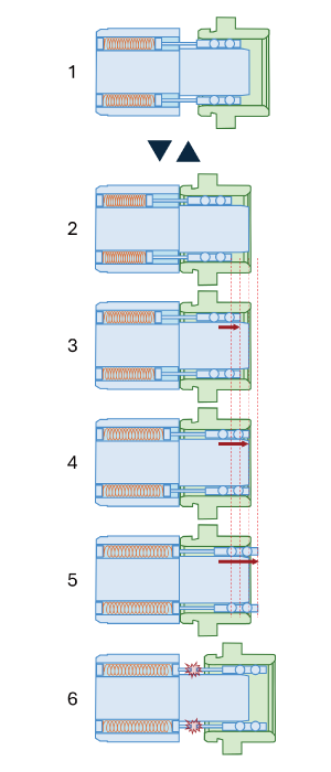 この状態でもスプリングの力が加わり続けるため、リテーナが徐々に初期位置の方向へ進み、最終的には初期位置で停止します。(右図3~5)